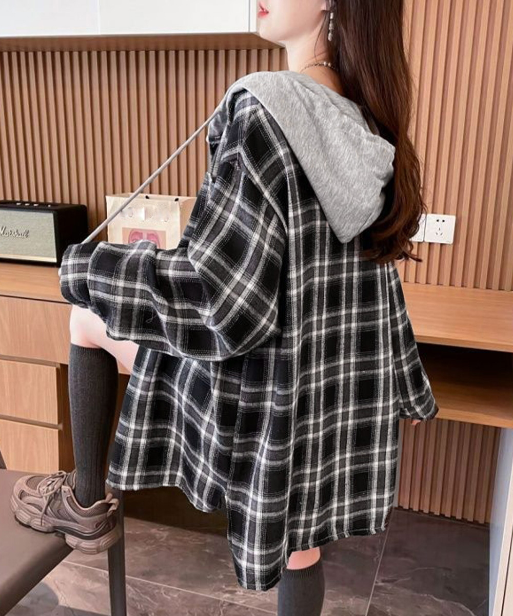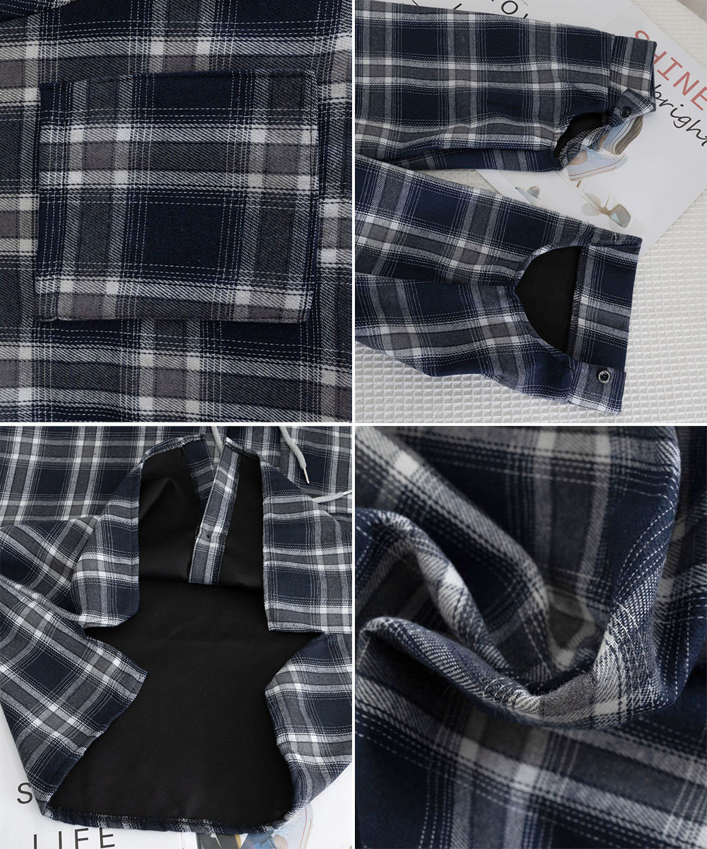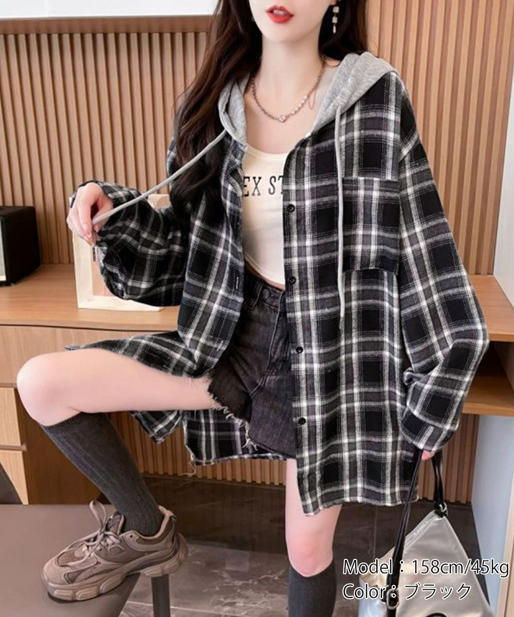 微起毛切替BIGフードシャツ オーバーサイズシャツジャケット ヴィンテージ チェックシャツ ゆったり ネルシャツアウター 起毛シャツブラウス 春秋ライトアウター ビエラチェック秋服 柔らかいビエラ素材で仕立てた、シーズンムード漂うチェックBIGシャツ。 カジュアルなフード付きデザインの切り替えディテールが目を引く、こなれ感たっぷりの一枚。 レイヤード次第でロングシーズン着回せるのもうれしいポイント。 春先はライトアウターに、初秋は一枚で主役に、冬はアウターの上からフードを出してもおしゃれに楽しめる一枚。 素材:ポリエステル85%+綿15% カラー:ブラック/ネイビー サイズ:ワンサイズ 着丈:前丈約75/後ろ丈約79cm 肩幅:約51cm 袖丈:約55cm ゆき:約80.5cm 身幅:約62cm 胸囲:約124cm 裏地:なし 伸縮性:なし 透け感:なし 生産国:中国 ※すべて平置きサイズです(採寸方法違いより、多少の誤差がございますので、ご了承ください)。 ※海外輸入品のため、商品の細部仕様は多少異なる場合がございます。予めご了承の上、ご注文お願い致します。