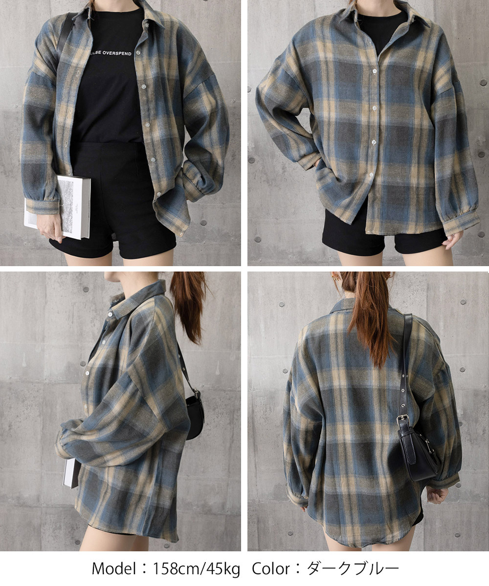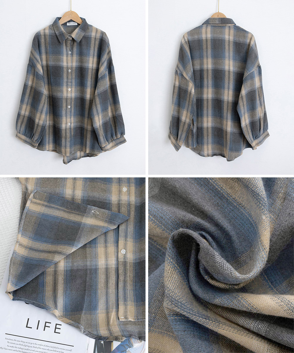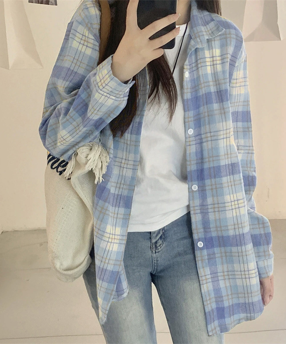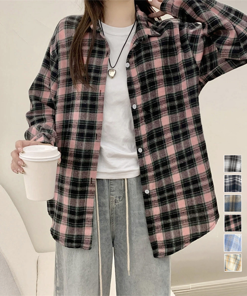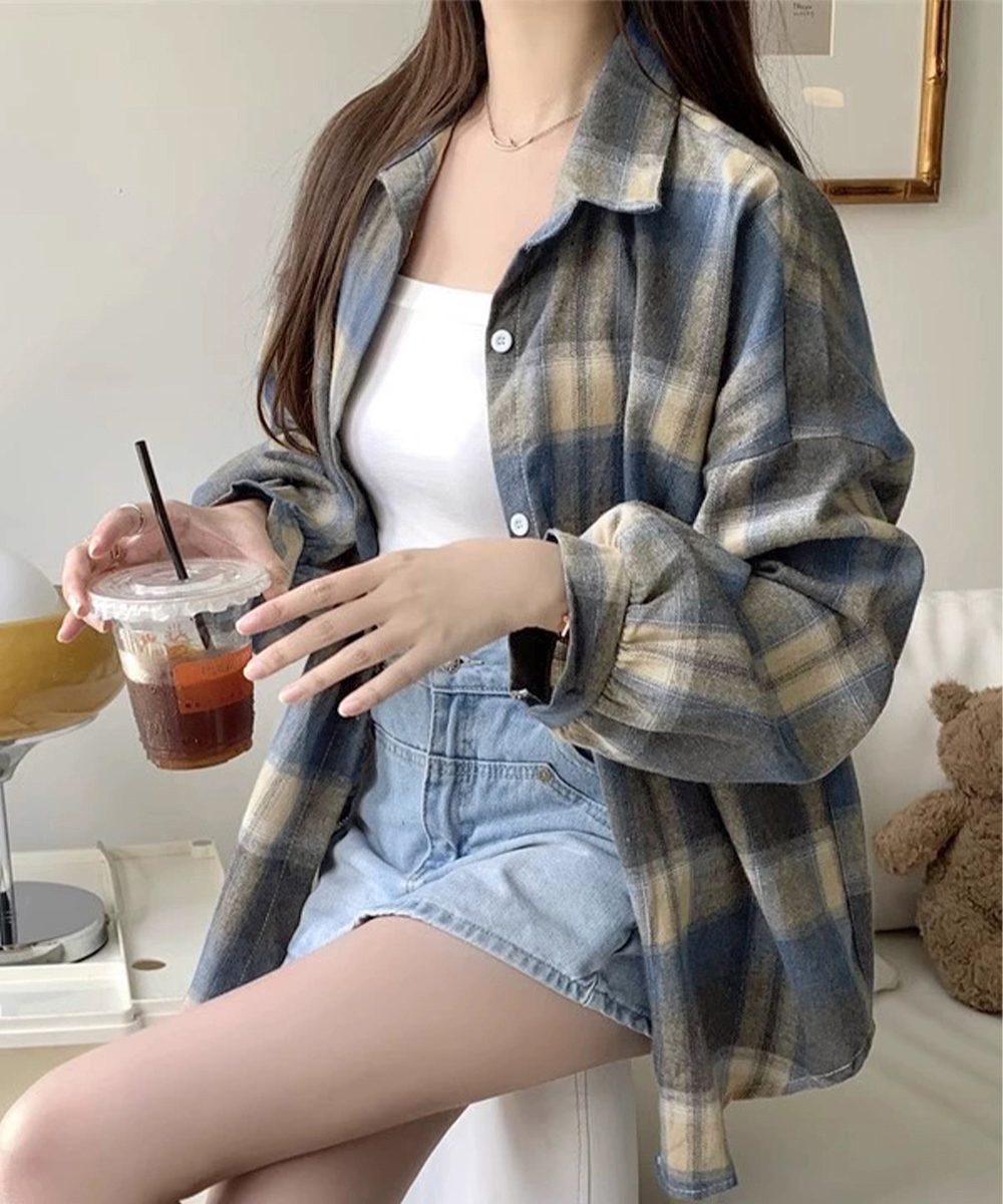 大人カジュアルなチェック 服の代表格、韓国風レトロデザインのゆったりシャツです。