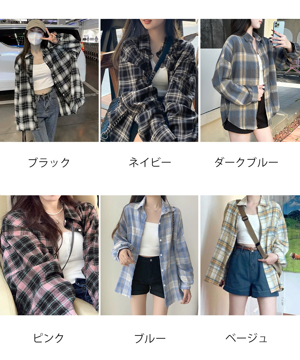 大人カジュアル チェック柄シャツ ゆったりシャツカーディガン 長袖ライトアウター 体型カバー羽織り韓国風ビッグシャツ四季 ビッグチェック春服 オーバーサイズ秋服 ストリート服韓国風 韓国風レトロデザインのオーバーサイズチェックシャツ。 ゆったりシルエットで体型カバーしつつ、リラックスした着心地。 大人っぽいチェック柄がアクセントになり、全6色展開でコーディネートに彩りをプラス。 デニムやショートパンツと合わせるだけで、こなれたカジュアルスタイルが完成。 春秋は1枚で、夏は日よけや冷房対策に、秋冬はインナーとしてオールシーズン活躍。 素材:綿65%+ポリエステル35% カラー:ブラック/ネイビー/ダークブルー/ピンク/ブルー/ベージュ サイズ:ワンサイズ 着丈:前丈約69cm/後丈約73cm 肩幅:約64cm 袖丈:約41cm ゆき:約73cm 身幅:約56cm 胸囲:約112cm 裏地:なし 伸縮性:なし 透け感:なし 生産国:中国 ※すべて平置きサイズです(採寸方法違いより、多少の誤差がございますので、ご了承ください)。 ※海外輸入品のため、商品の細部仕様は多少異なる場合がございます。予めご了承の上、ご注文お願い致します。