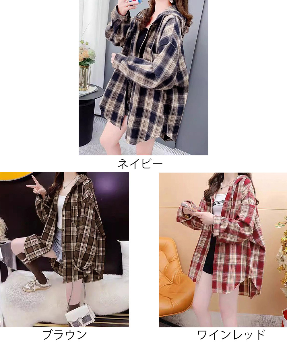 BIGフードシャツ レディース ゆったりレトロ シャツブラウスこなれ感 フーデッドシャツ カジュアル 体型カバートップス 着やせシャツ韓国風 春秋ライトアウター チェック柄 羽織り フード付きデザインがカジュアルな印象を与える、オーバーサイズのチェックシャツ。 ゆったりとしたシルエットで体型カバーにも◎、1枚でも羽織りとしても便利。 前後差をつけたラウンド裾でお尻周りもオシャレにカバー。 ほどよい厚さで季節問わず着回し可能。夏は日よけや冷房対策に、春秋は一枚着やカーディガンとして、冬はニットやコートのインナーに重ねて活躍。 素材:ポリエステル85%+綿15% カラー:ネイビー/ブラウン/ワインレッド サイズ:ワンサイズ 着丈:前丈約66cm/後ろ丈約73cm 肩幅:約56cm 袖丈:約52cm ゆき:約80cm 身幅:約58cm 胸囲:約116cm 裏地:なし 伸縮性:なし 透け感:なし 生産国:中国 ※すべて平置きサイズです(採寸方法違いより、多少の誤差がございますので、ご了承ください)。 ※海外輸入品のため、商品の細部仕様は多少異なる場合がございます。予めご了承の上、ご注文お願い致します。