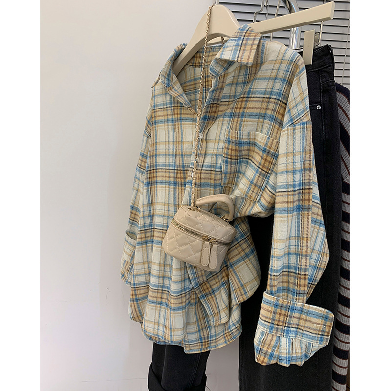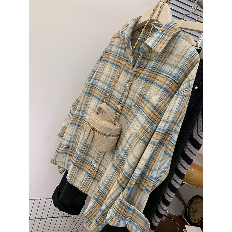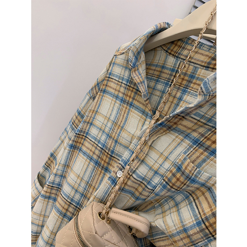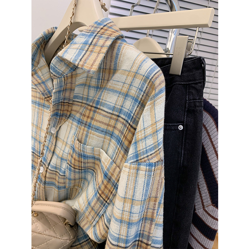 おしゃれなチェック柄が魅力的な韓国風長袖ブラウスです。
