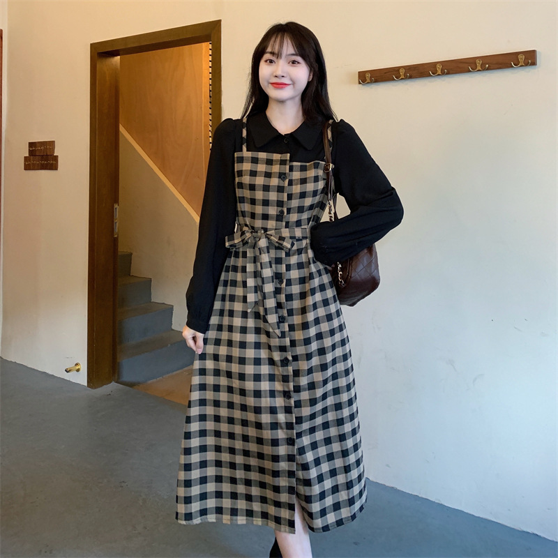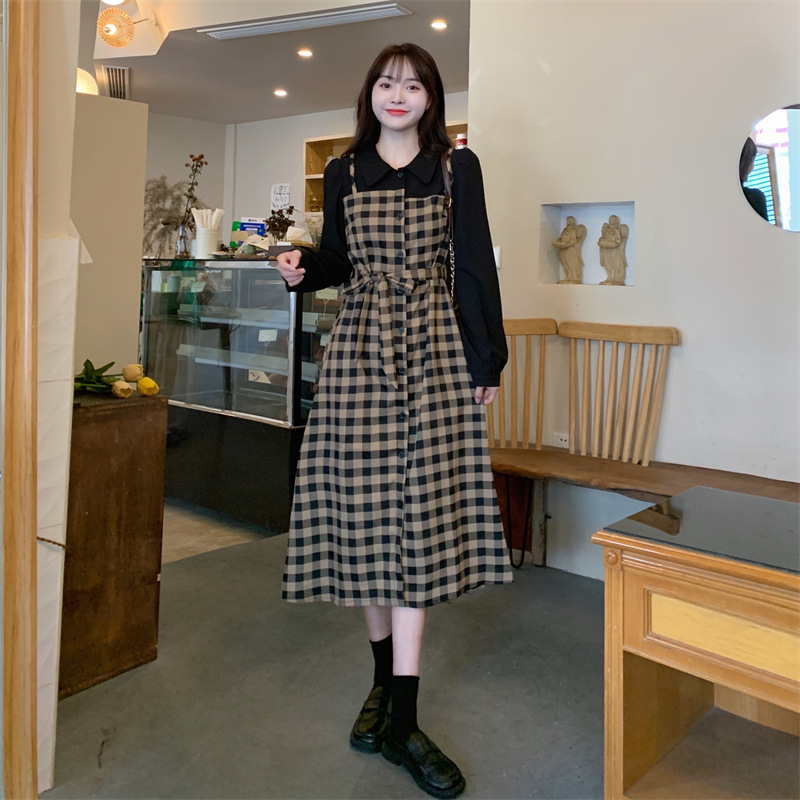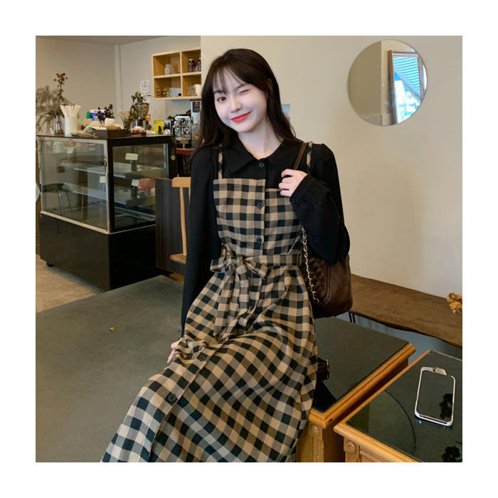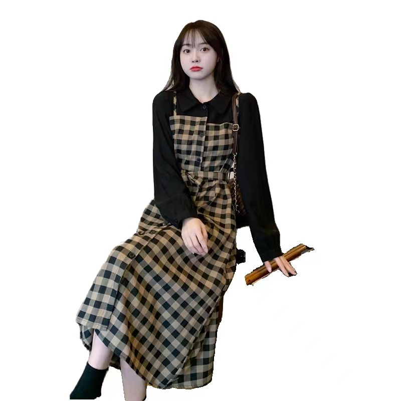 黒のトップスとチェック柄スカート部分の組み合わせがとてもおしゃれ。