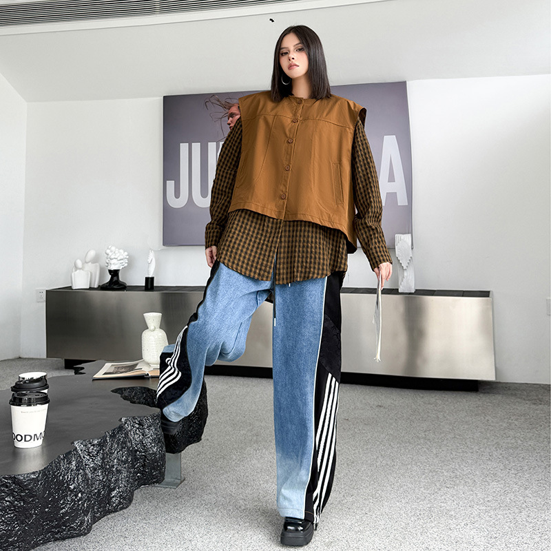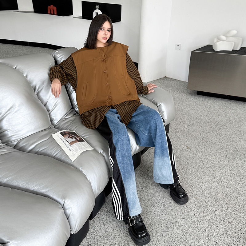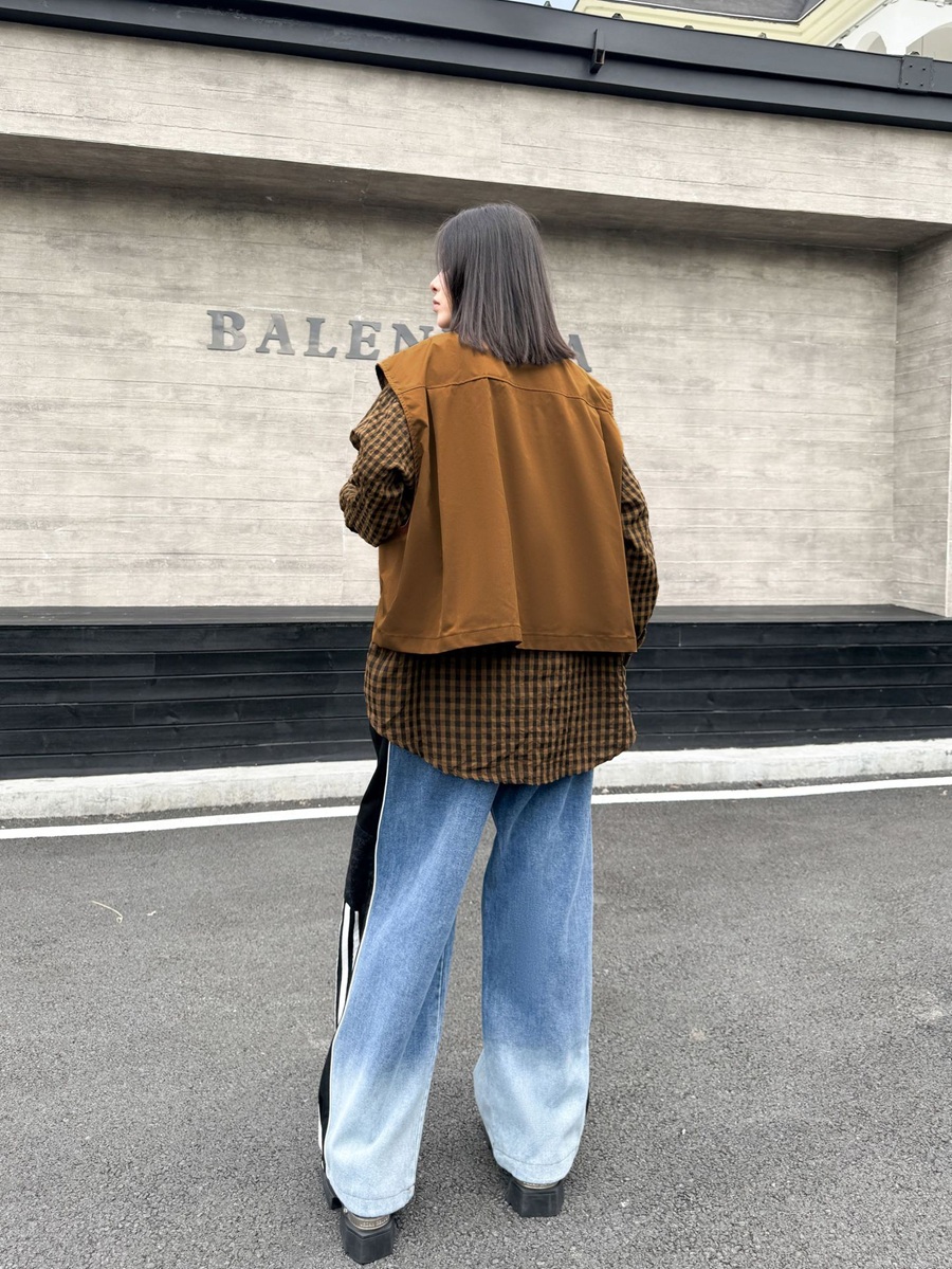 個性的なチェック柄シャツとベストの重ね着風デザインが魅力的なトップスです。