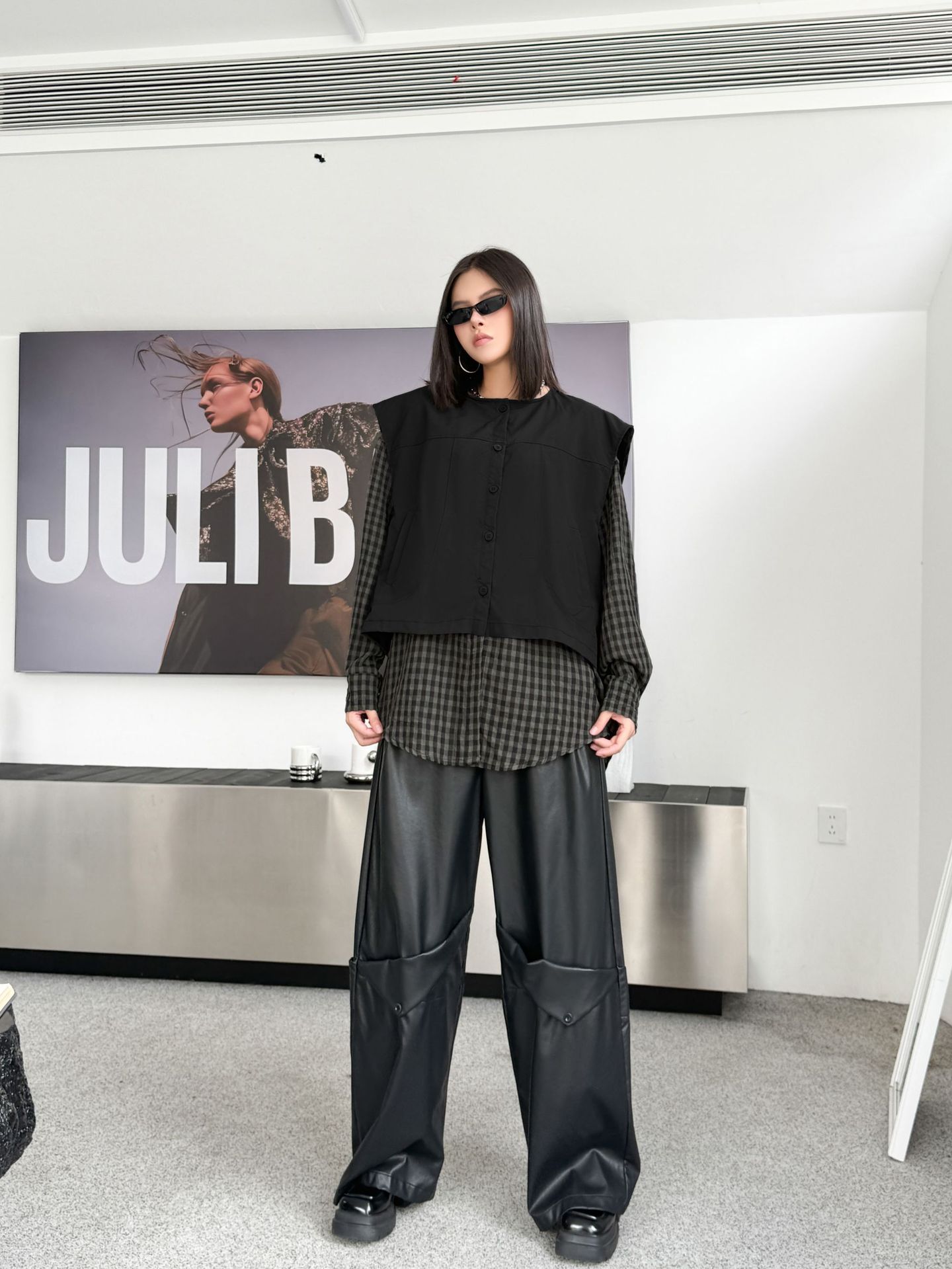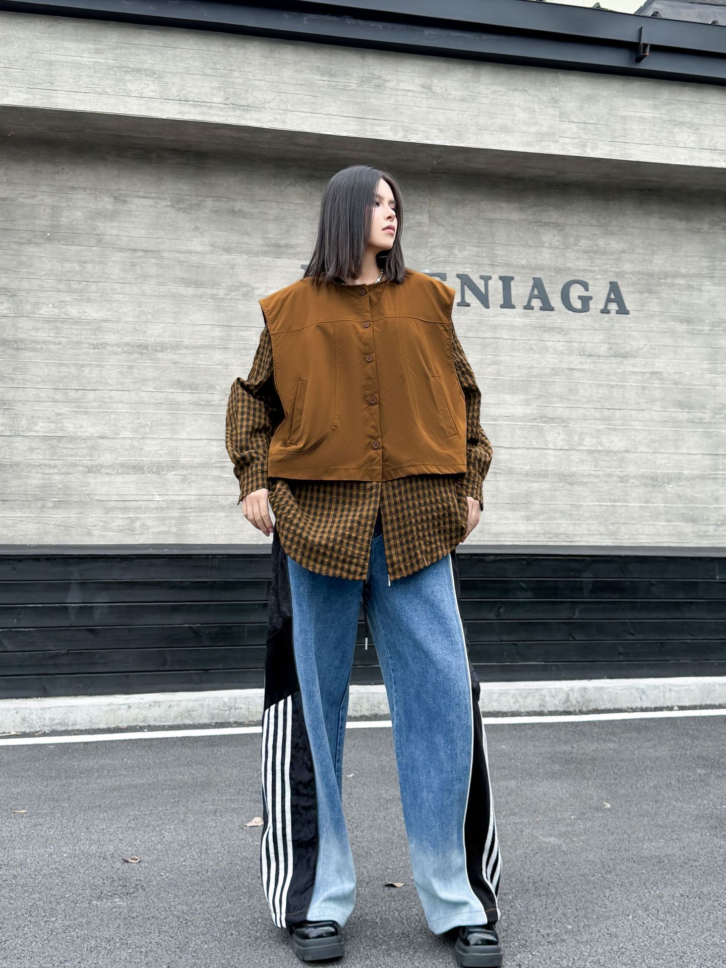 チェック服の新しいスタイルを楽しめる一枚です。
