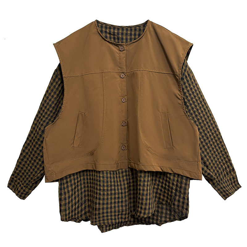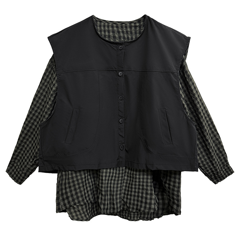 素材:綿麻 個性的なチェック柄シャツとベストの重ね着風デザインが魅力的なトップスです。 ゆったりとしたシルエットで着心地抜群。 チェック服の新しいスタイルを楽しめる一枚です。