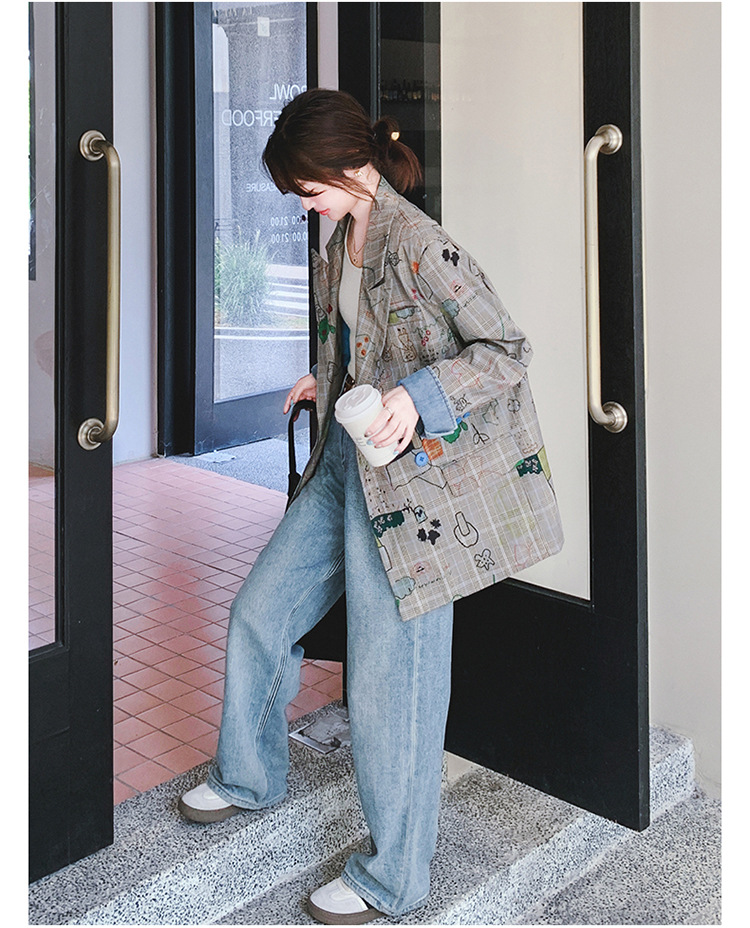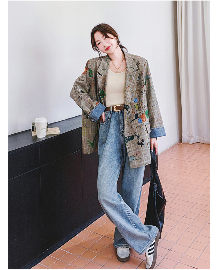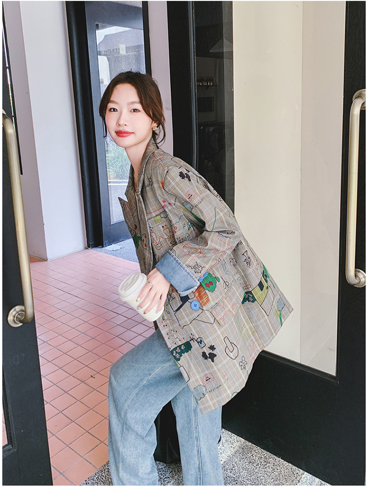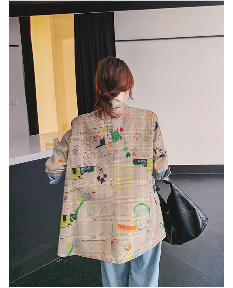個性的なプリント柄が魅力的なチェック柄ジャケットです。 カラフルなグラフィックプリントがアクセントになり、普通のチェック服とは一味違う仕上がりに。 ゆったりとしたシルエットでカジュアルコーデにぴったり。 デニムパンツとの相性も抜群です。