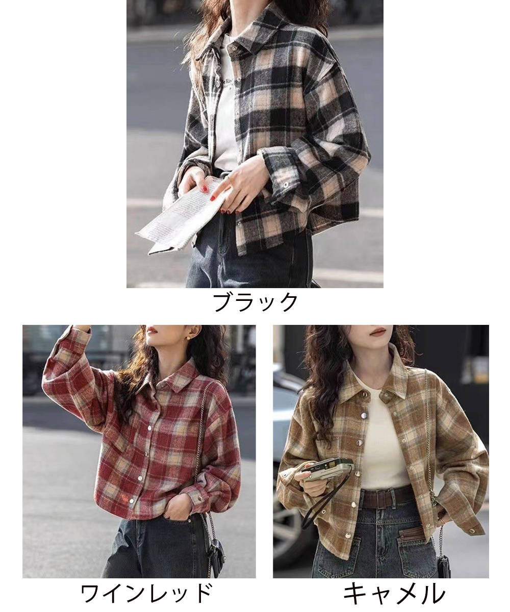 レディースライトアウター ヴィンテージライク 羽織り 体型カバー 韓国風 シャツジャケット 大人カジュアル 襟付きシャツ ドロップショルダー 着回し 短丈シャツ 春秋シャツ お洒落 ショート丈が今っぽい、チェック柄シャツトップス。 バランスの取りやすい短丈デザインで、ハイウエストボトムとの相性抜群。 デニムやスカートと合わせるだけで、こなれた大人カジュアルスタイルに。 素材:ポリエステル85%+綿15% カラー:ブラック/ワインレッド/キャメル サイズ:ワンサイズ 着丈:約49cm 肩幅:約46cm 袖丈:約48cm ゆき:約71cm 身幅:約47cm 胸囲:約94cm 裏地:なし 伸縮性:なし 透け感:なし