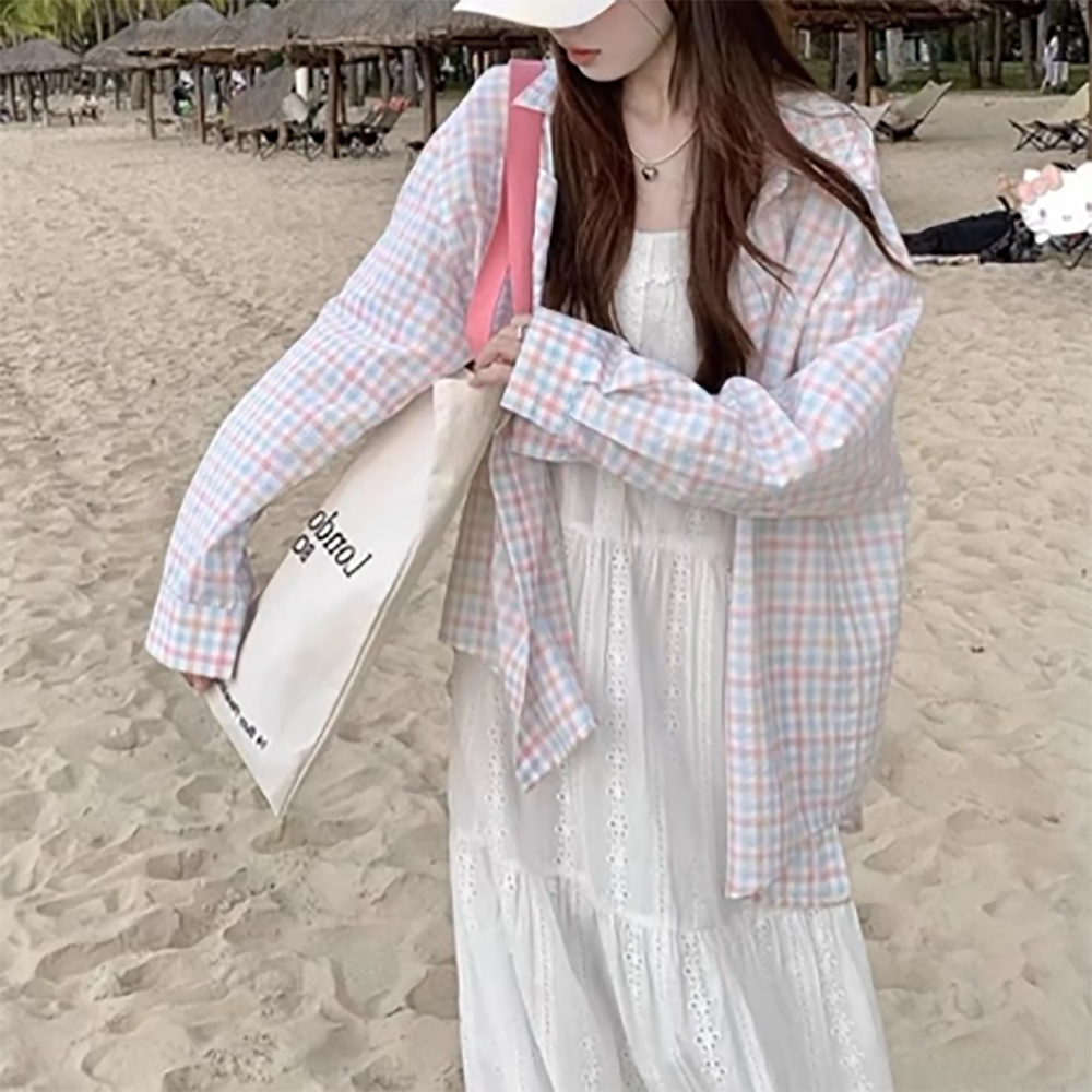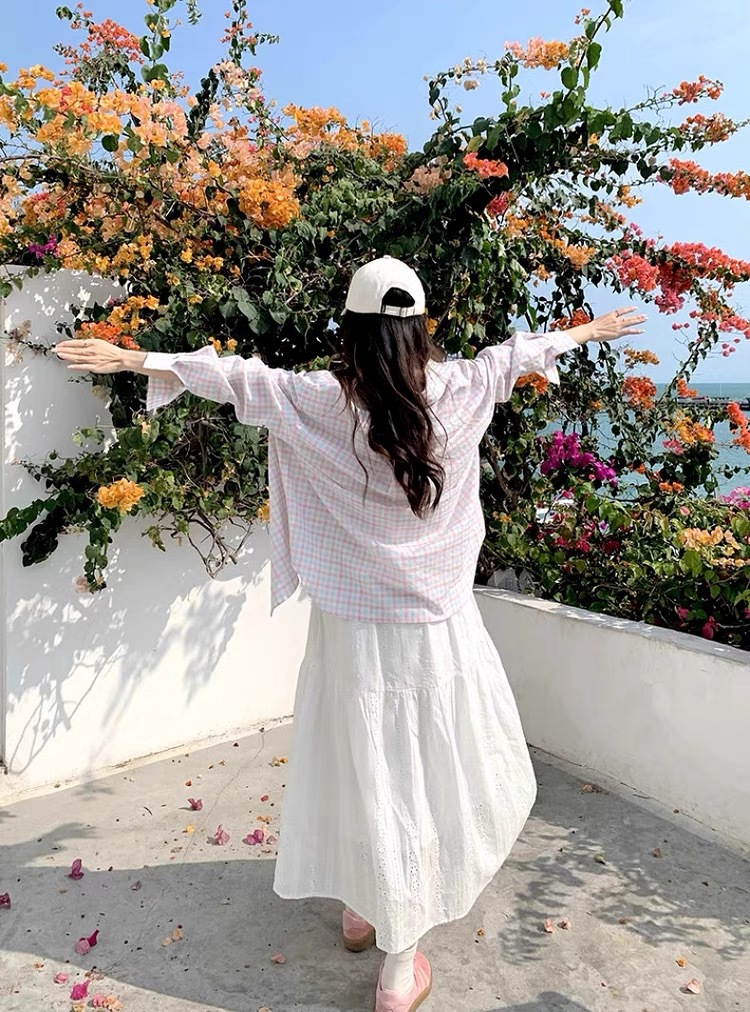 チェック服の定番アイテムとして、白いワンピースとの重ね着スタイルも楽しめます。