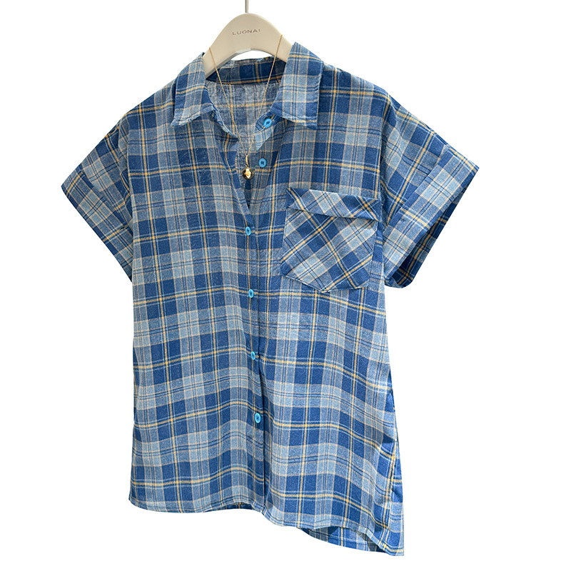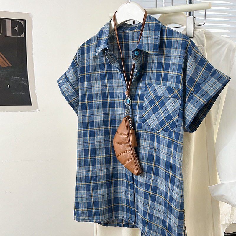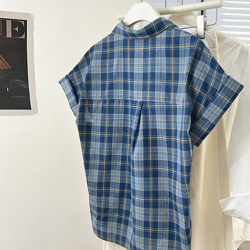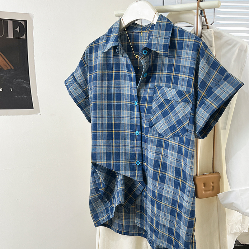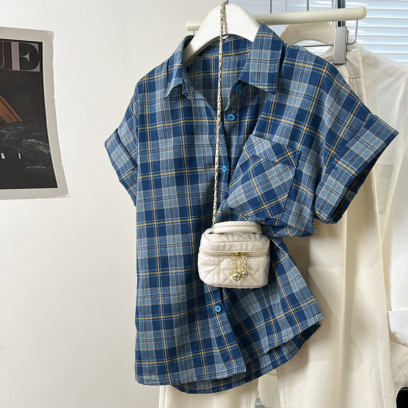 爽やかなブルー系のチェック柄が印象的な半袖ブラウスです。